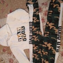 Excellent suits, cotton, height 130, length of black trousers 75 cm, pants camouflage with white inserts are shorter and their cuffs are wider. On warm spring or cool summer days-the most it! Very fast shipping!